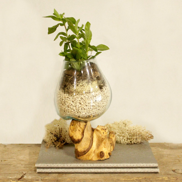 Le verre est soufflé à la main et alors qu'il est encore chaud, il est détendu sur un morceau de racine de Gamal, le verre durcit alors à la forme du bois pour un ajustement parfait. Ils sont fabriqués en utilisant un produit naturel en utilisant des outils à la main à la manière traditionnelle balinaise.